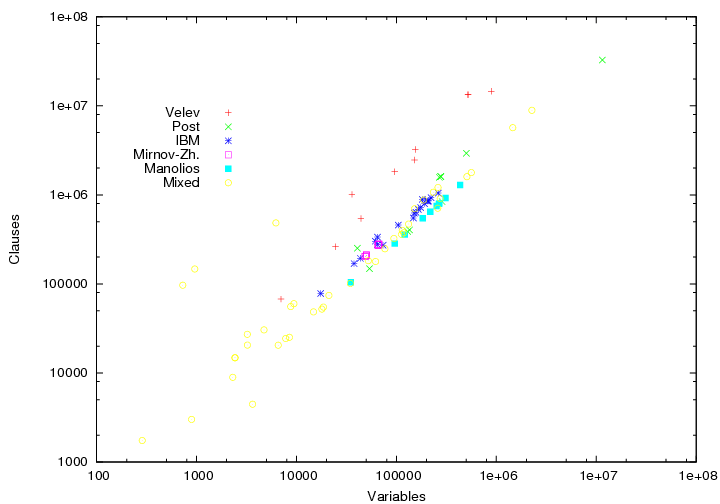 CNF instance sizes: number of clauses of each instance plotted against the number of variables of the instance.